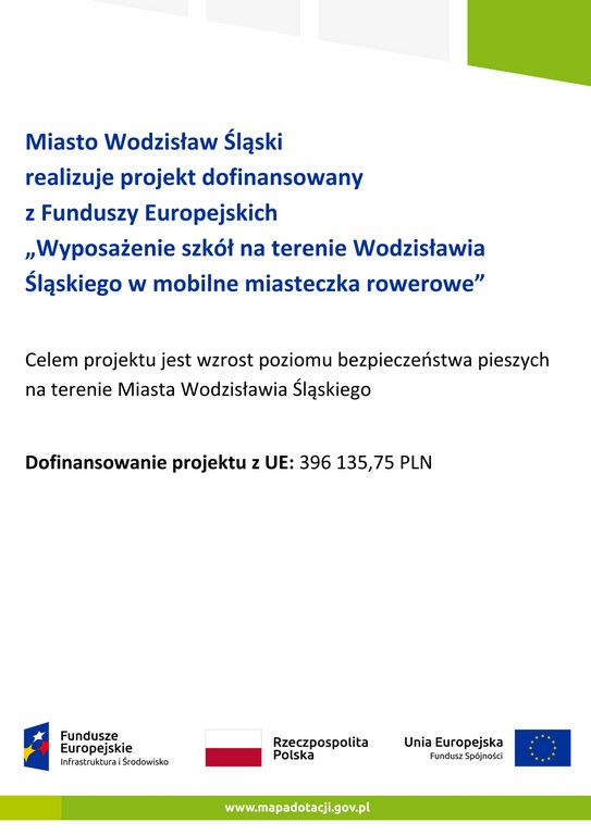 Więcej „Wielka Liga Czytelników”Miasto Wodzisław Śląski otrzymało dofinansowanie z Programu Operacyjnego Infrastruktura i Środowisko na lata 2014-2020. Dzięki wspomnianym środkom nasza szkoła wyposażona została w mobilne miasteczko rowerowe. Celem projektu jest stworzenie bezpiecznej i użytecznej bazy edukacyjno-sportowej dla dzieci i młodzieży z Wodzisławia Śląskiego. Dofinansowanie pozwoliło na zakup mobilnych miasteczek rowerowych dla ośmiu placówek oświatowych na terenie miasta.